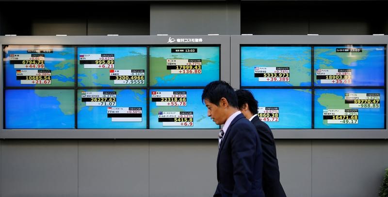 © Reuters. Men walk past an electronic board showing Japan's Nikkei average outside a brokerage in Tokyo